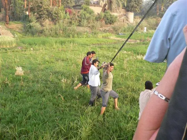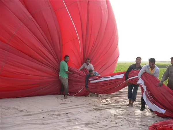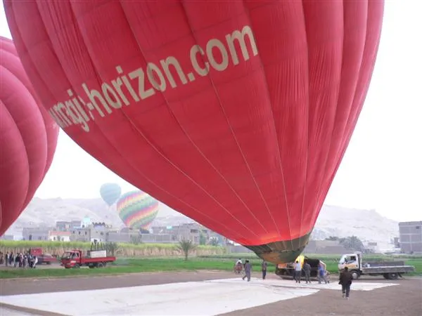 我們的氣球飄離其他的很遠,人家的在帝王谷山頭附近,我們的則一直往尼羅河飄,船長把氣球降到一些田上低飛然後再升高,再降下。然後在河邊的一片濕地著陸……