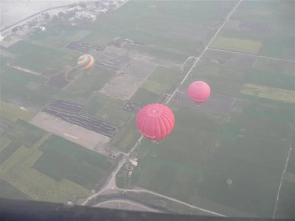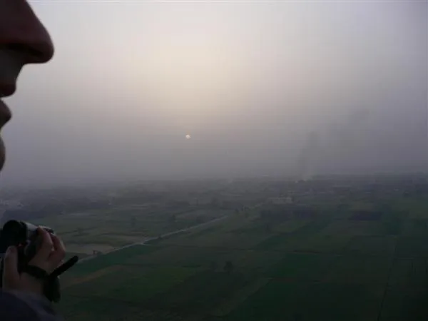 升空了,很熱呢。當氣球慢慢上升,周圍的噪音少了。天氣不好,看得見 Temple of Hatshepsut ,但帝王谷和王妃谷就看不清。地上的田,很多都生火了,不知是否因太乾的關係。升到很高,船長說看看日出。我們看見那個細小而早已升得高高的太陽,都 wow…… 這是日出…